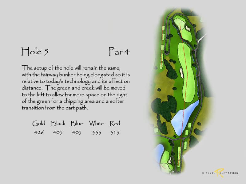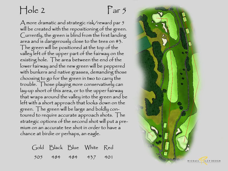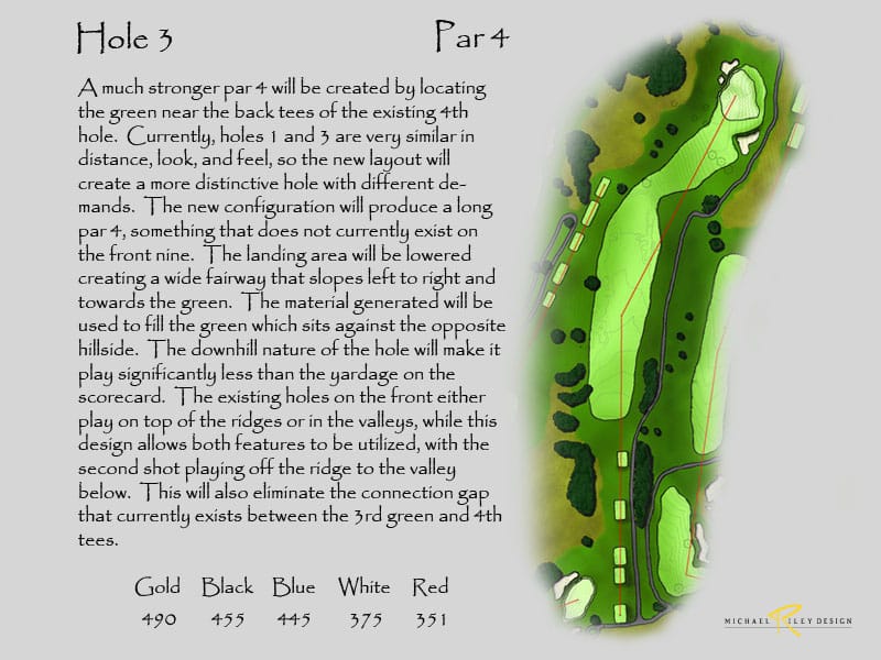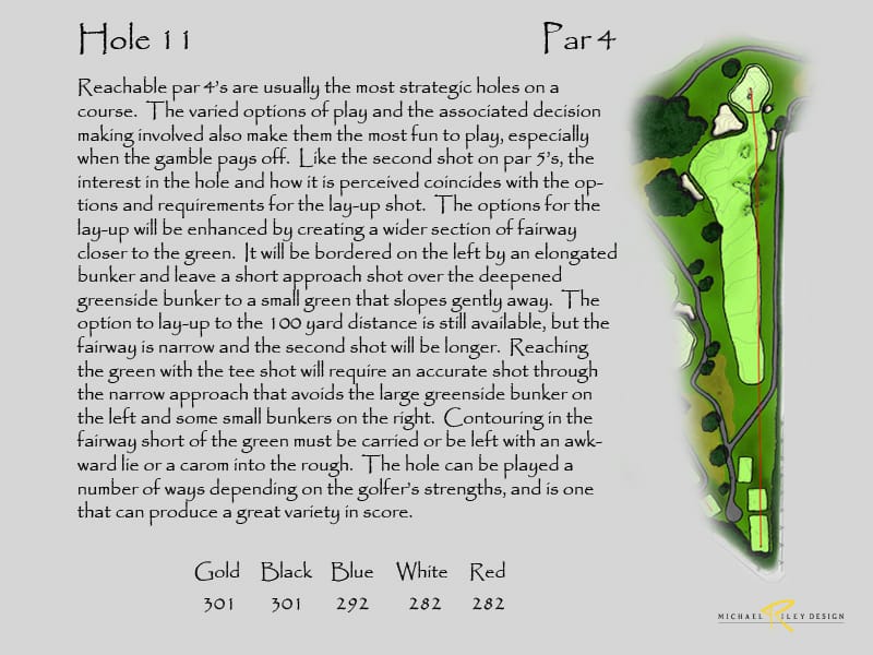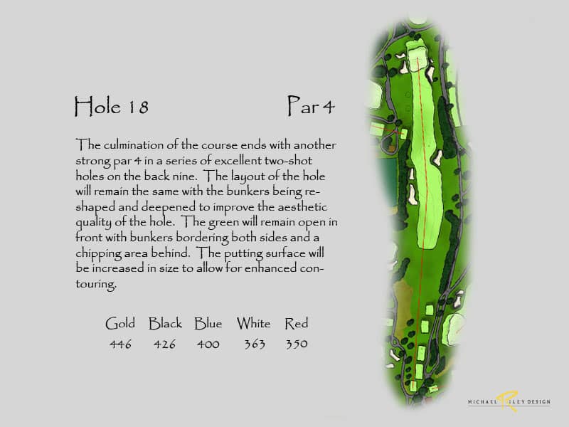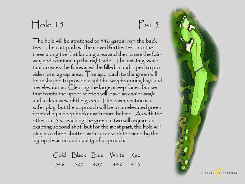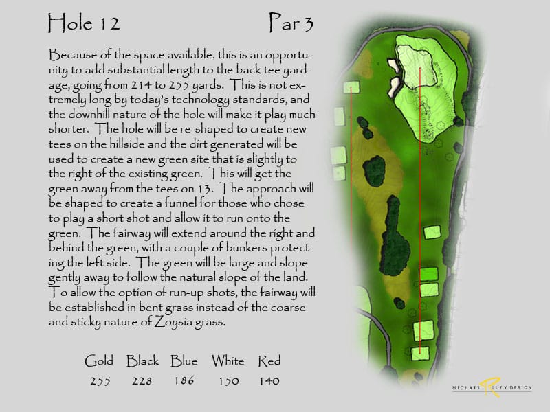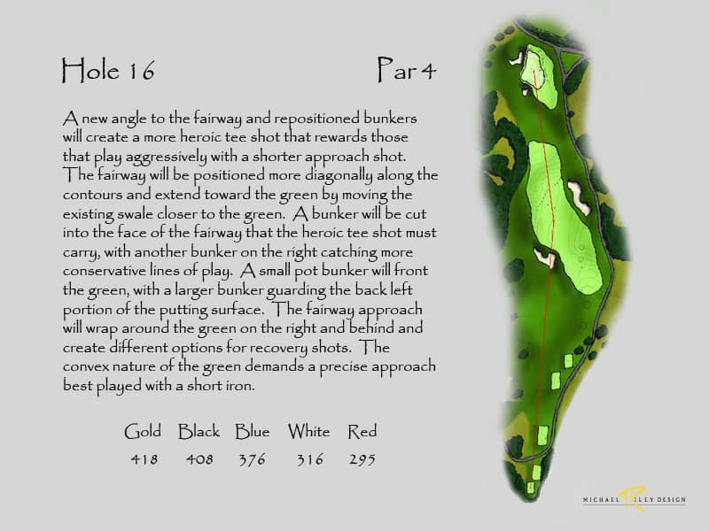 Netting at the back of the range would still be needed to keeping bounding balls from entering the new 17th hole. Additional landscaping would be suggested to screen the netting and also provide more separation from the driving range. This configuration would produce two outstanding holes. Currently, holes 16 and 17 are the same length on the card and are very short with today’s technology, so changing 17 would produce a much stronger finish. And, the new holes add 30 yards to the overall length.