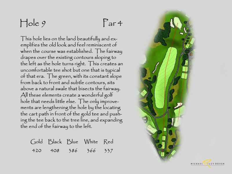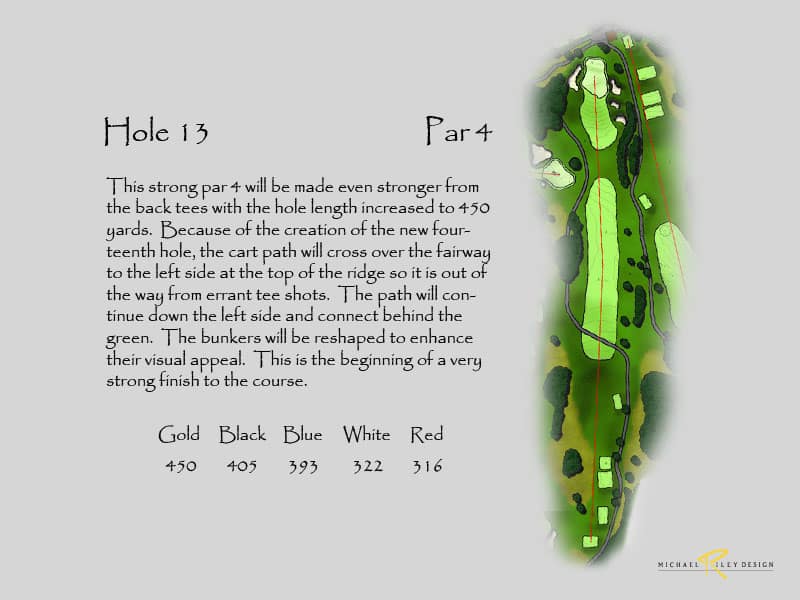 There are places throughout the West course to lengthen the holes to achieve a total length over 7,000 yards. At first glance, holes that could be lengthened are #9, #12, #13, #15, and #16. If the 14th and l7th holes are relocated, their new combined lengths would increase the overall length by 30 yards. As mentioned before, adding any significant length to the East course is a difficult proposition based on the present configuration.