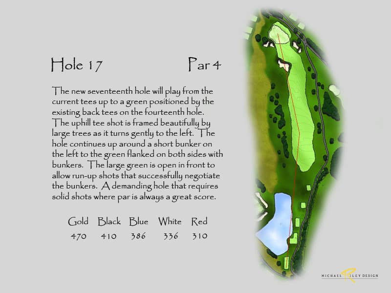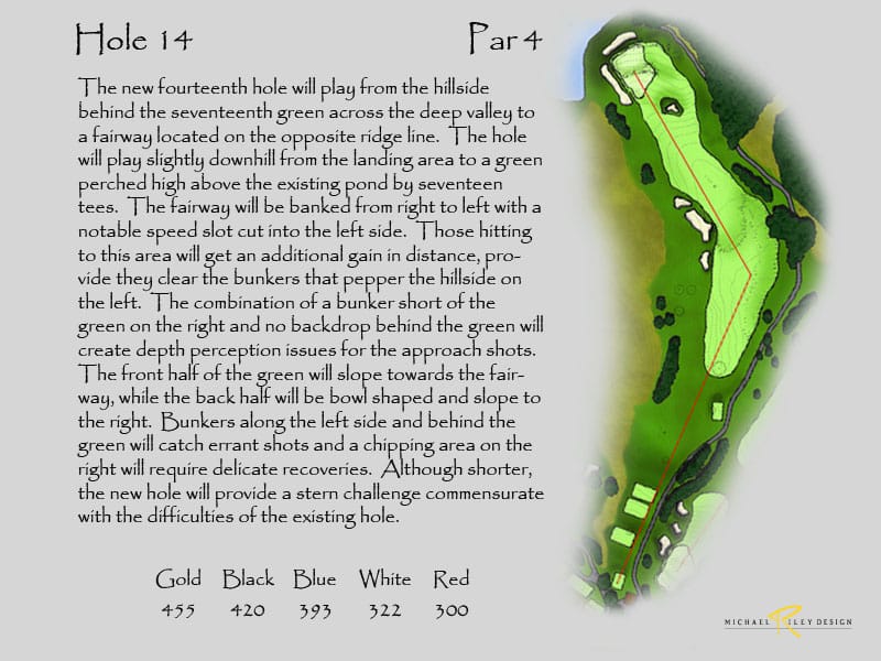 ln order to lengthen the range in its present location, the 14th hole would need to be relocated so the second half of the hole, where the danger exists from balls from the range, can become part of the range expansion. A new 14th hole could be built on the land between the 13th and 17th holes. The tee would be located next to the 13th green and play over the current 17th green to the ridgeline and then dogleg slightly left to a green situated above the current pond on 17. The hole would measure approximately 450 yards. A new 17th hole would also ne ed to be constructed, playing from the existing tees across the pond on a line towards the beginning of the existing 14th fairway. The hole would turn lightly left to the green which would sit where the tees on 14 now exist. The hole would measure approximately 470 yards, with most of the m being uphill. This would allow the range to be 300 yards, which is me assured from the middle of the back tees to the greenside bunker on the existing 14th green.