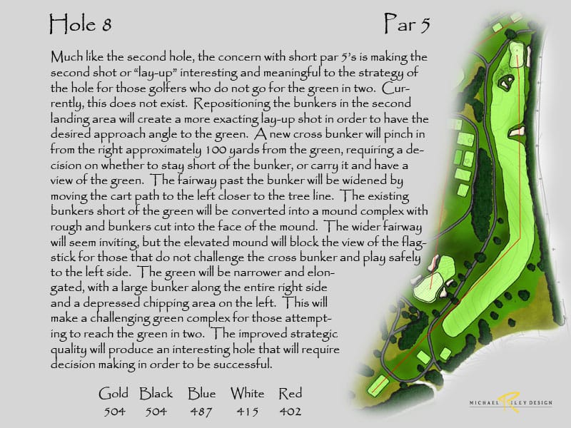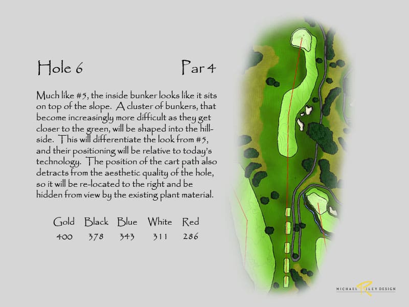 Cart paths have become a fixture on virtually all courses today, except for rare instances where only caddies exist. Their existence, although unsightly, helps produce better turf conditions by providing a solid surface for carts and maintenance vehicles to travel on, especially in high traffic areas and during unusual weather patterns. Their location is always a dilemma, since they need to be far enough to be “out of play” while still being close enough to reduce long walks. There are places on the course where the cart paths should be relocated further away from the playing areas and out of view. This will greatly enhance the aesthetic quality of the holes, an aspect all the great courses without paths enjoy. One example of this would be on #6, where the path location from the red tees up to the bunker greatly detracts from the hole and the natural setting in the valley. The path should be moved to the right around the large evergreen tree and shaped to be hidden from view as it ties back in by the bunker.