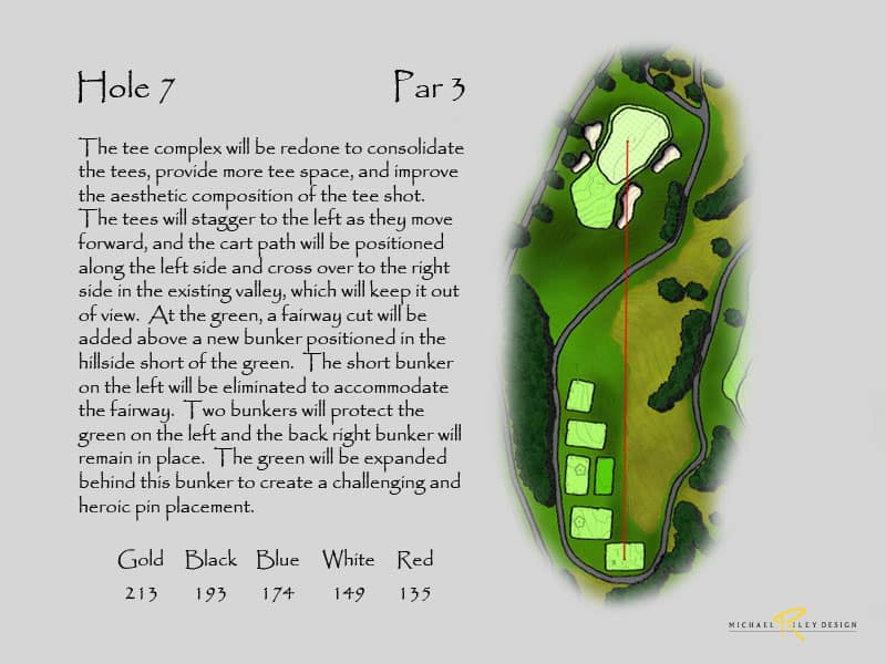 ln other cases, for instance on hole #7, the location of the tees need to be rearranged. Currently the cart path runs down the middle of the complex with multiple tees on each side. This arrangement, coupled with the placement of the ball washer and hole sign/garbage can, interrupts the foreground composition and greatly detracts from the overall aesthetics of the hole. The tees should be located so that the back tee is to the right and the other tees stagger to the left as they move forward. The cart path would be located along the left side of the tees and then cross back over underneath the complex in the valley and out of view. The ball washer and hole sign/garbage can could then be located along the path and subsequently also out of view. This will greatly improve the aesthetic quality of the hole, as well as strategically since the hardest angle is from the right and the green opens up more as the tees move left.