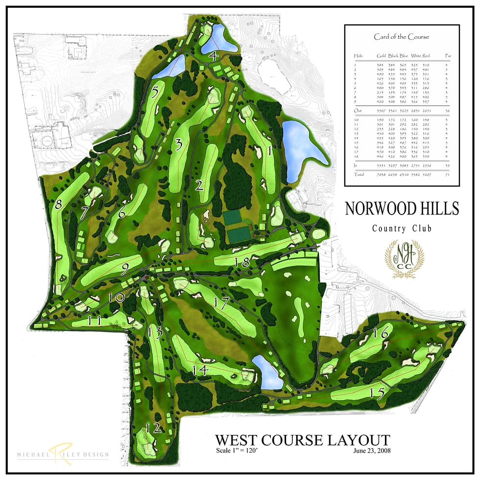 Norwood Hills Country Club has a storied history that few clubs can equal. The clubhouse was recently added to the National Register of Historical Places, and major championships have been held on the West course, most notably the 1948 PGA Championship won by Ben Hogan and recently the 2001 USGA Senior Amateur. The golf courses were designed by Wayne Stiles and established in 1922 during the Golden Age of Golf Design. While the West course enjoys a championship caliber reputation, the East course, although considerable shorter, still tests all aspects of the game. However, unlike building architecture, a golf course is alive and constantly changing, often subtly before the member’s eyes. Over a period of time, trees grow or are added narrowing the corridors of play, turf lines change, bunkers fill, and sand lines and green edges move about. And now with technology seemingly changing by the minute, courses play quite differently than envisioned decades ago. Both courses have been modified over the years by different people with mostly good results, but there are items that need to be addressed to keep improving the courses for the current membership and to attract new members for the long-term financial health of the club. A Master Plan for the club is ideal since it can address these items comprehensively. The plan would serve as a blueprint to follow in the coming years to enhance all aspects of the course and to ensure that the integrity and continuity of the design of both courses remains unified.